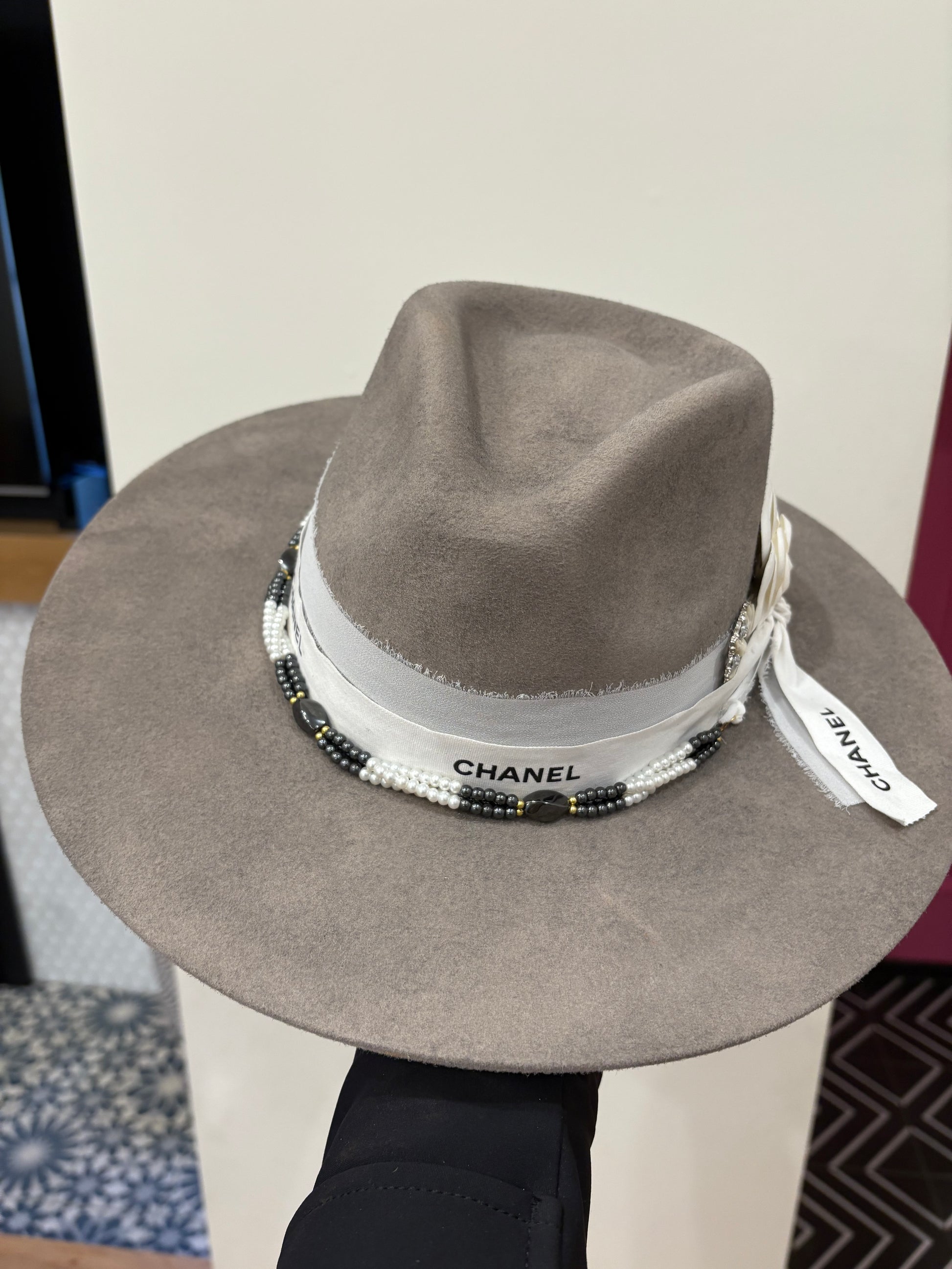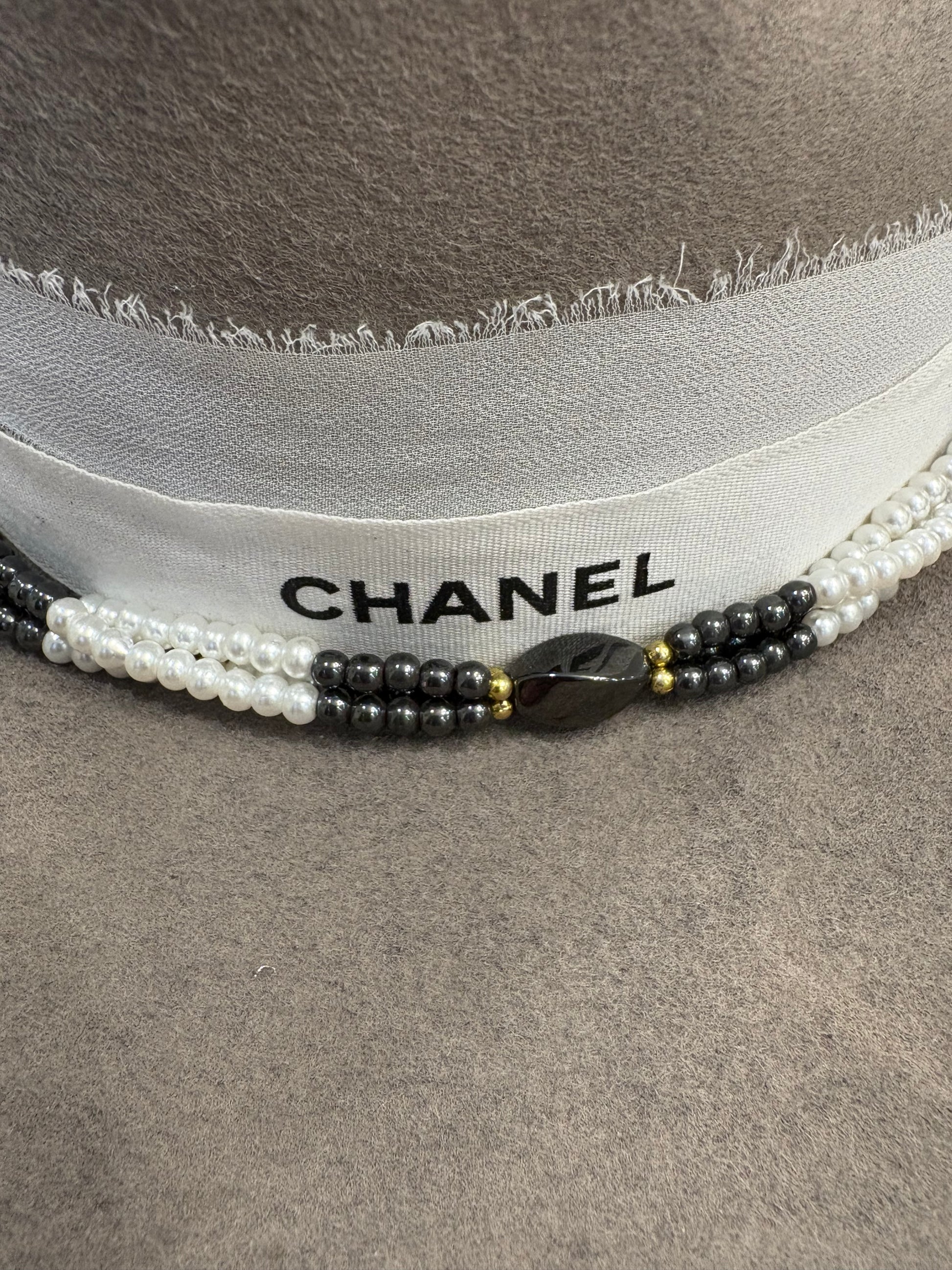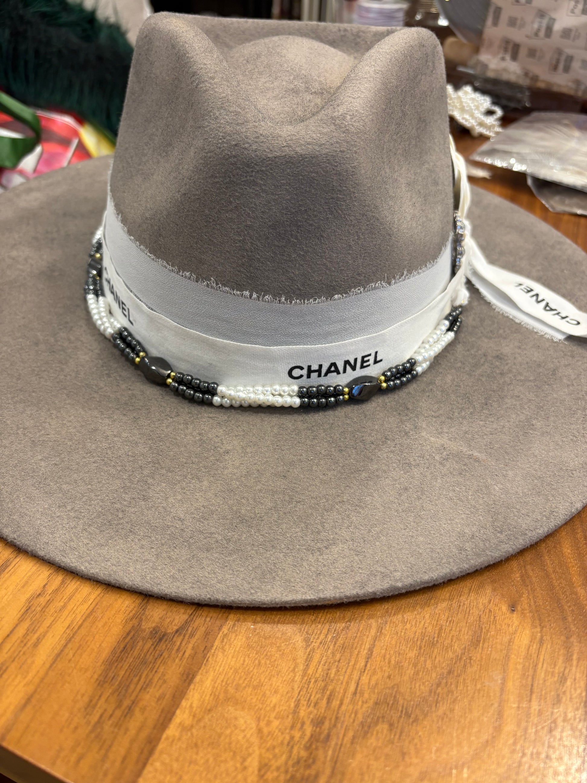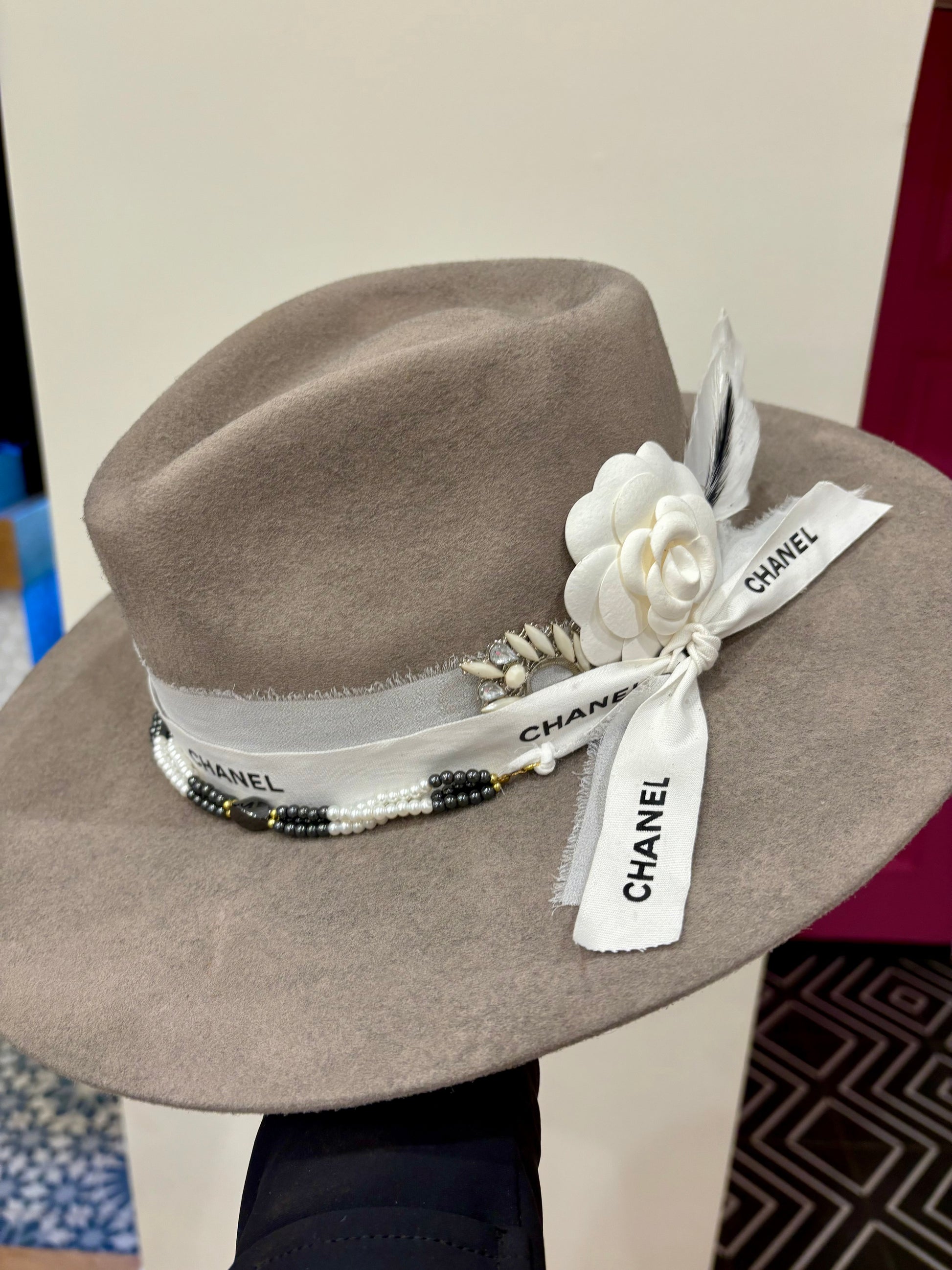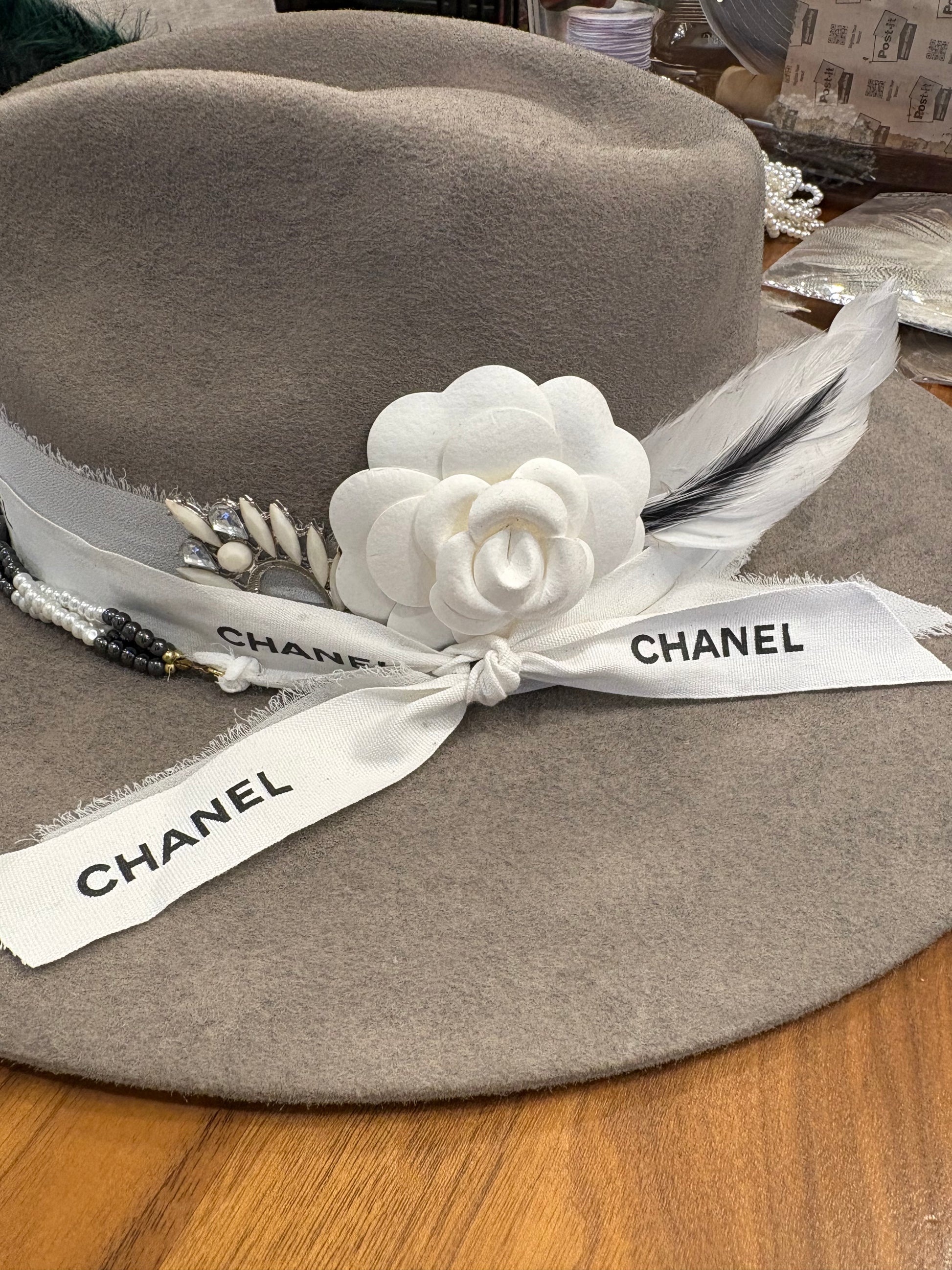 Camellia is hand painted grey with Chanel ribbon, Chanel camellia, and pearls!