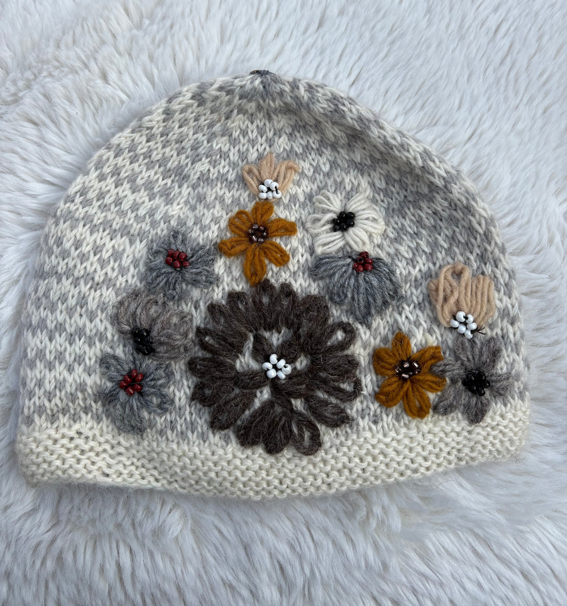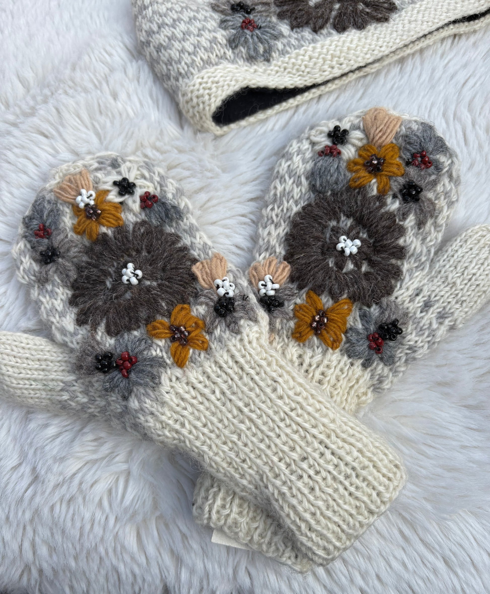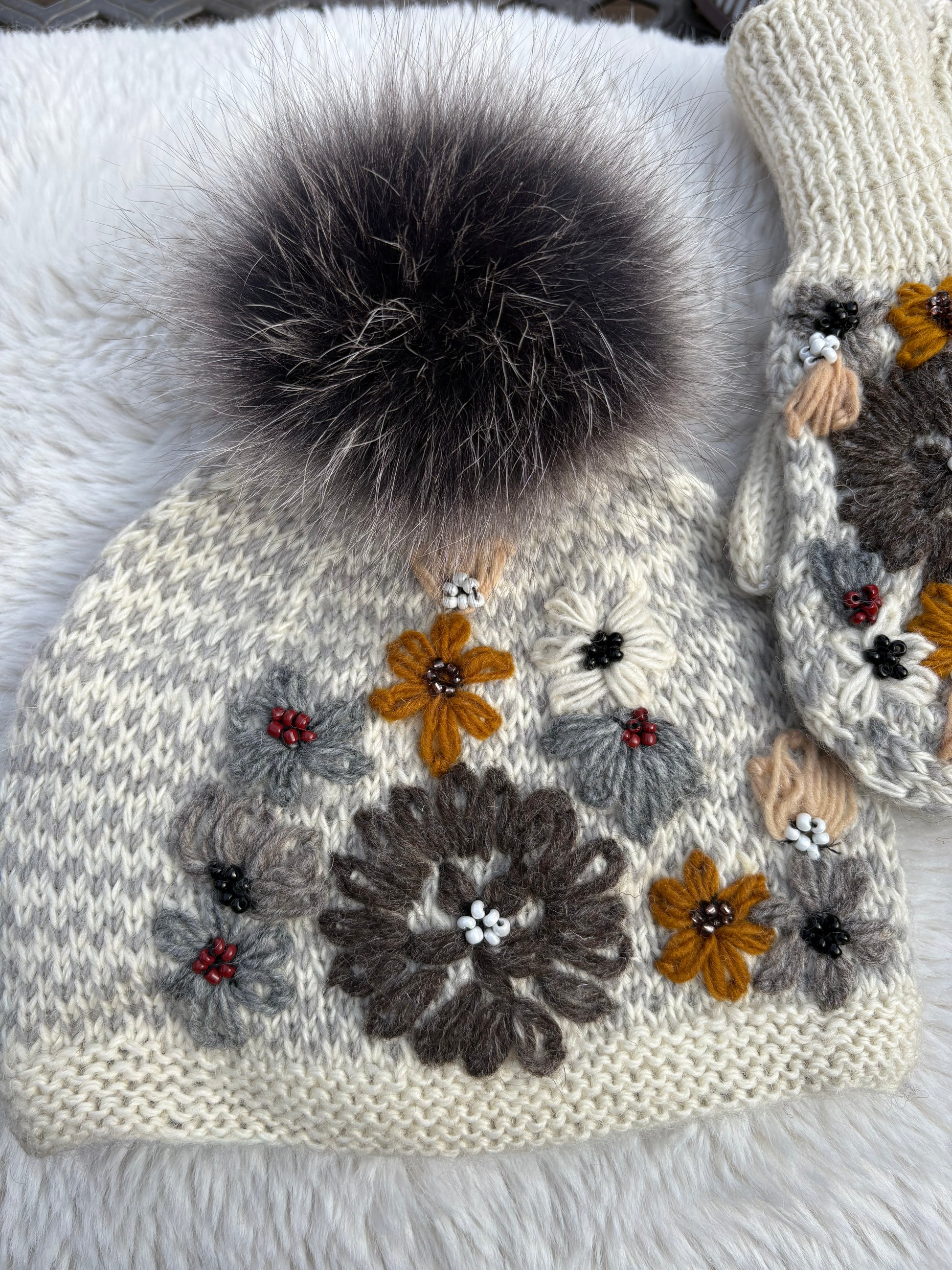 Beautiful snow hat with detachable fox fur Pom Pom with matching mittens This is Ella James herself wearing this hat and what will soon become your favorite winter hat! This set is my my mom’s favorite and so we named it after her! This is the perfect set to treat someone special this holiday season!