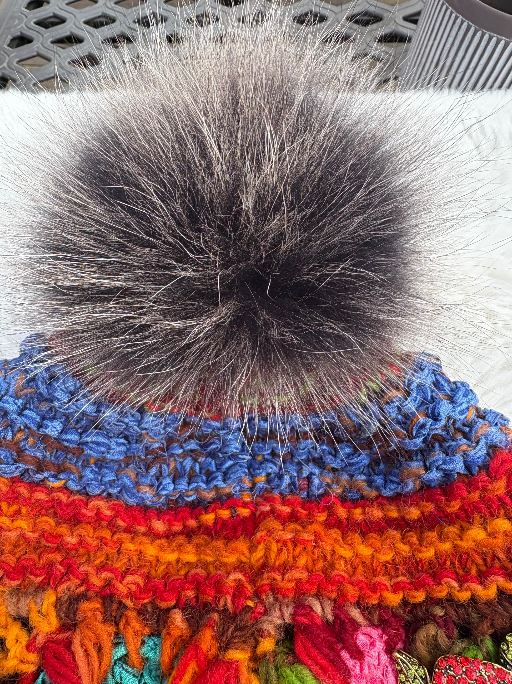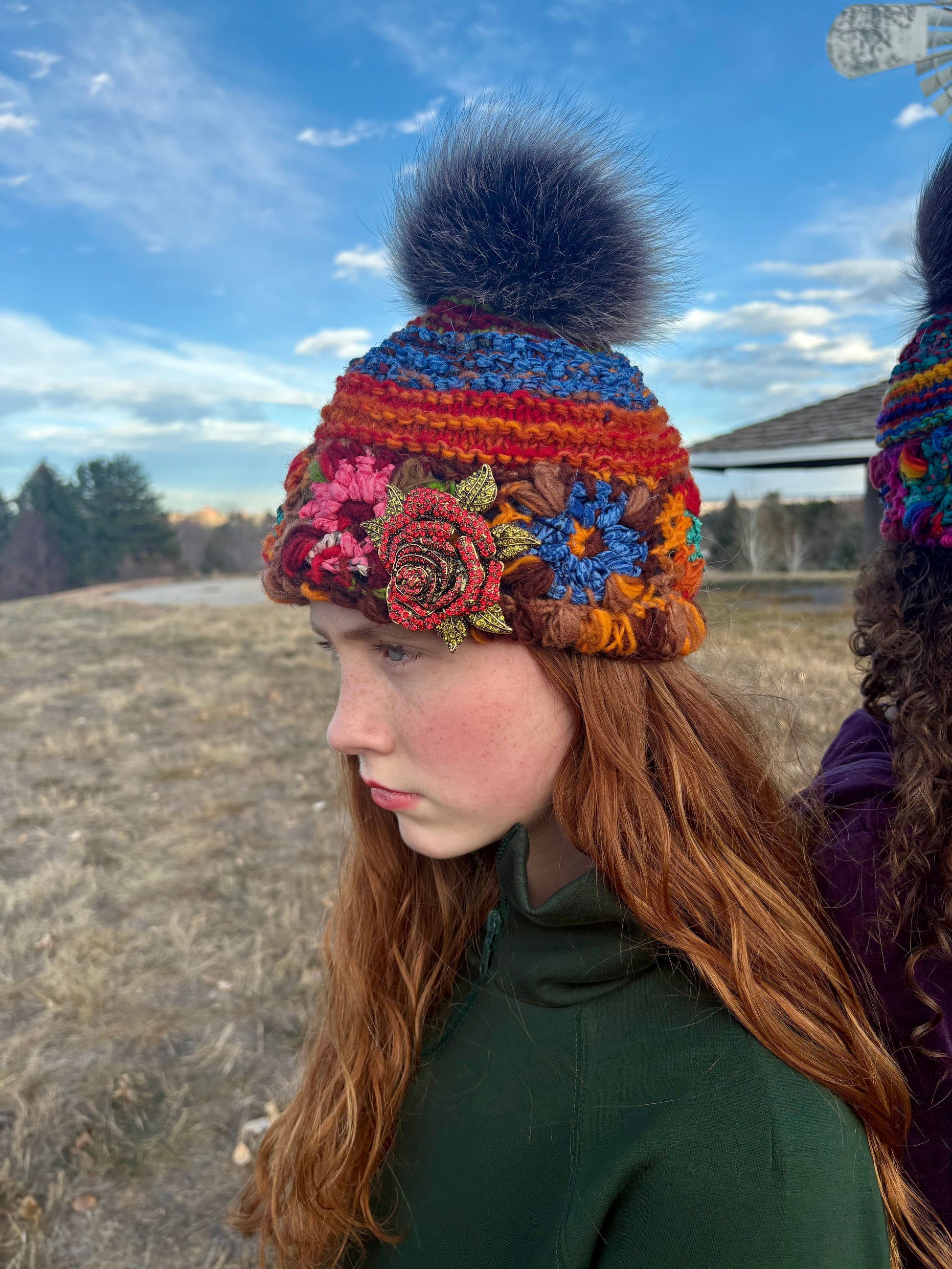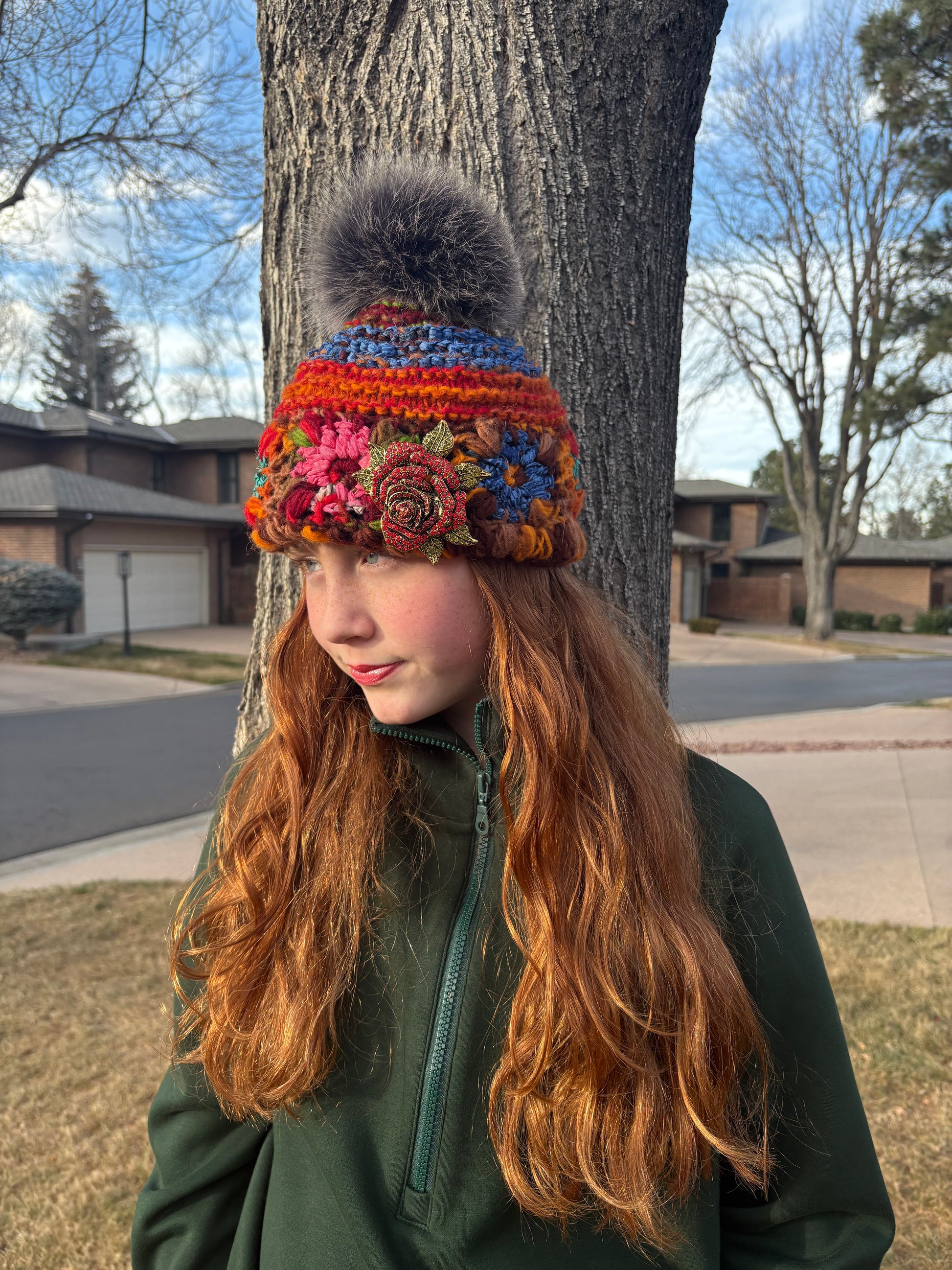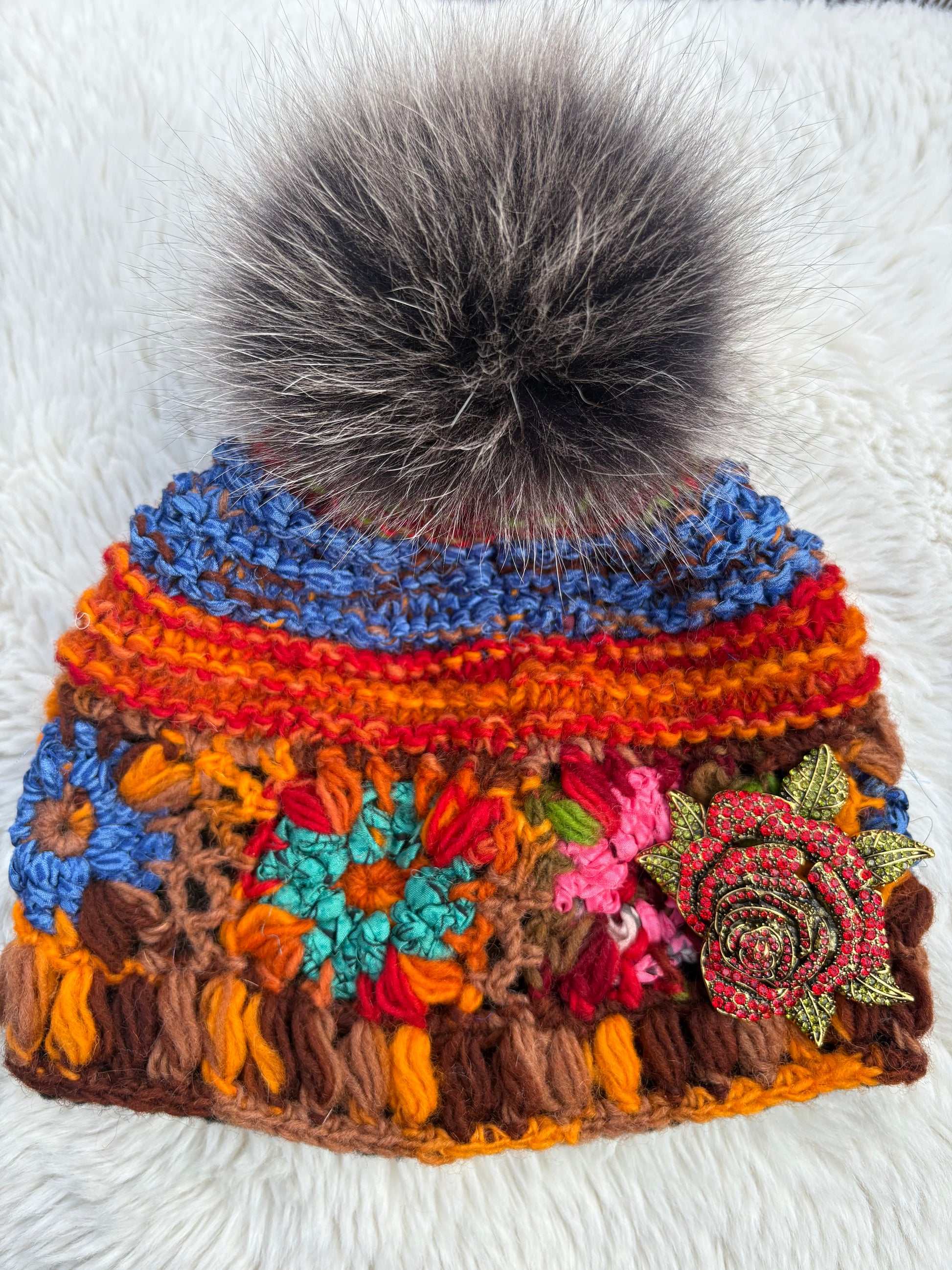 Beautiful snow hat with detachable fox fur Pom Pom and rose brooch! This is Ella James herself wearing this hat and what will soon become your favorite winter hat!