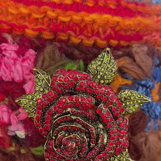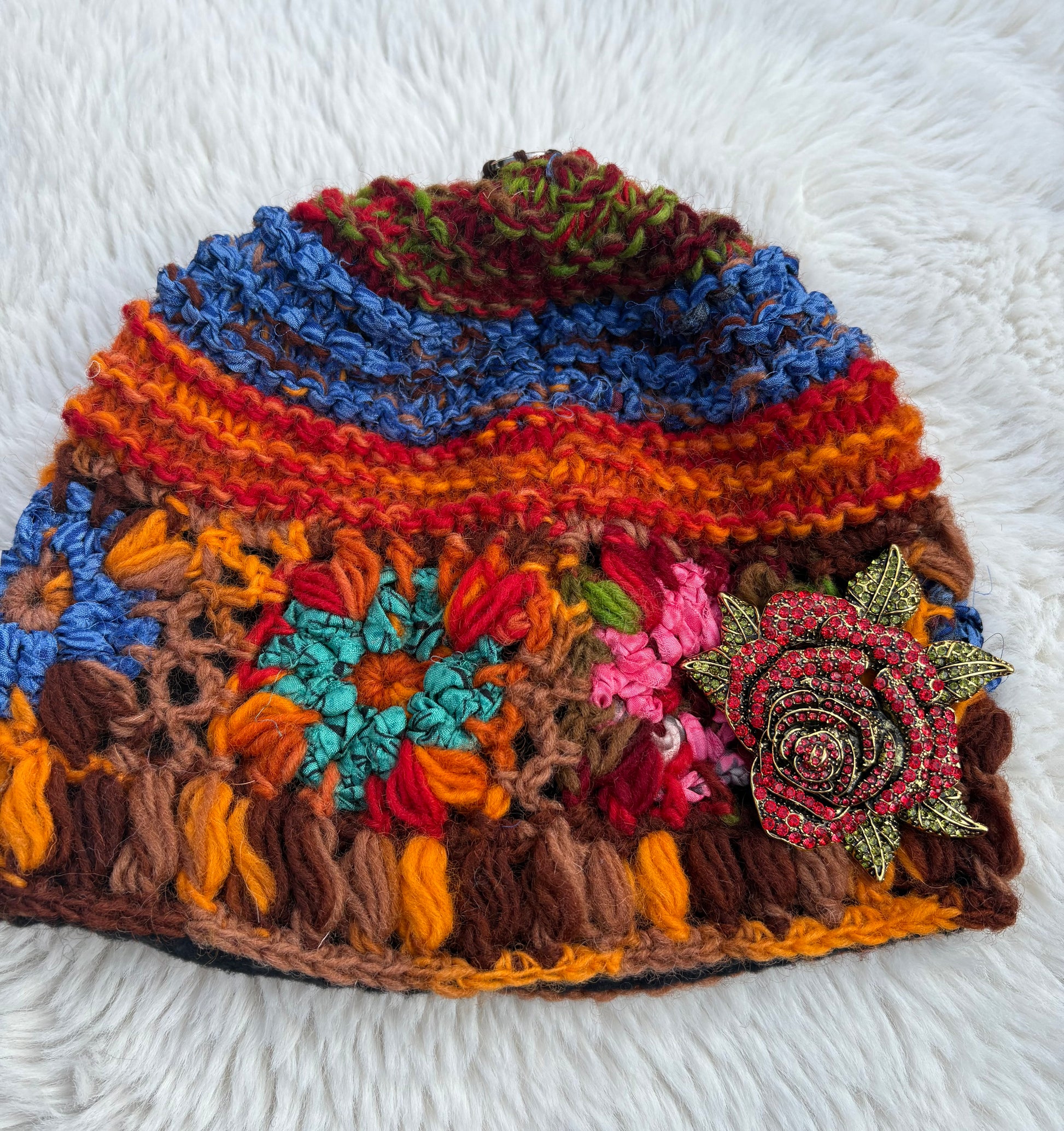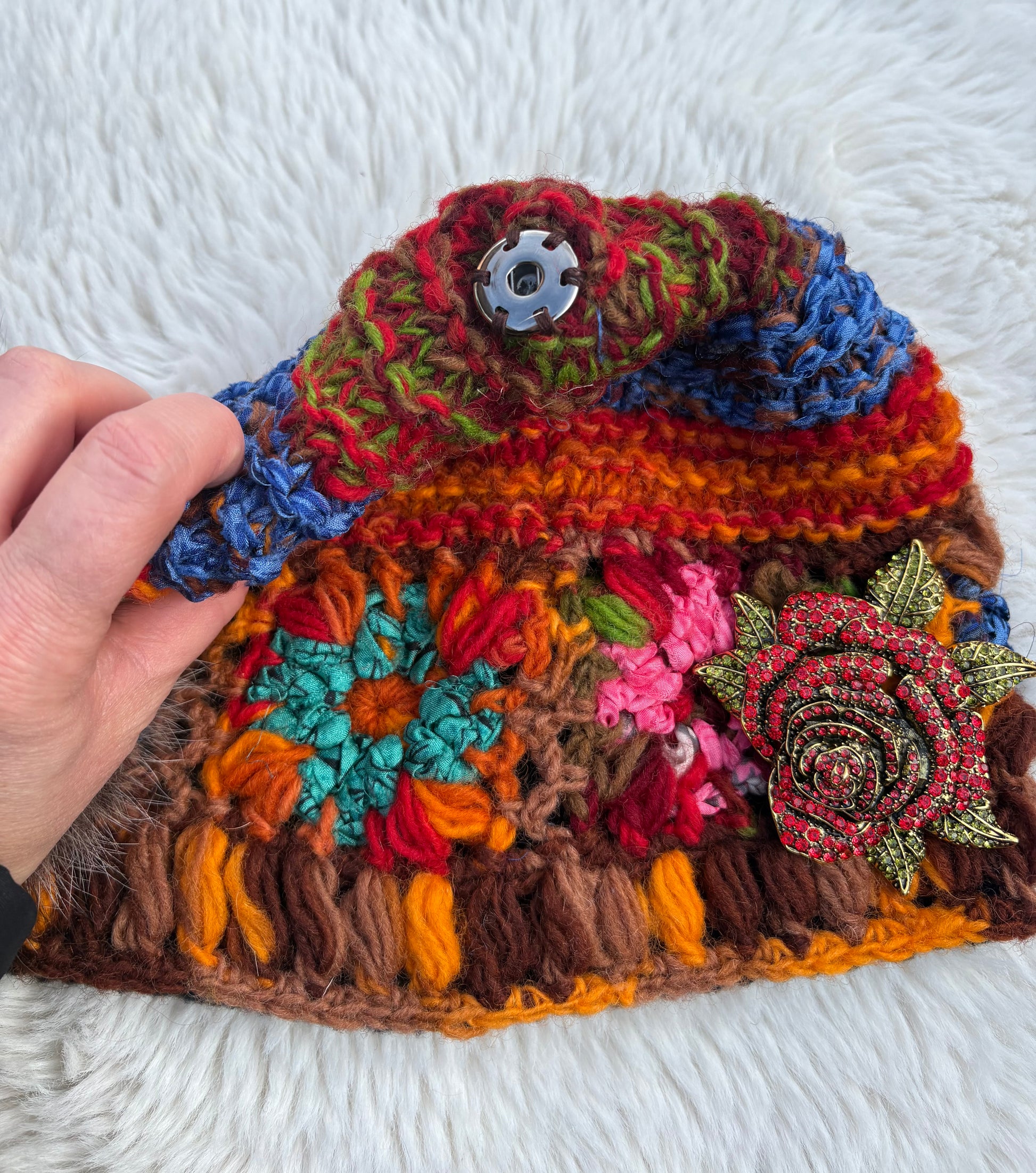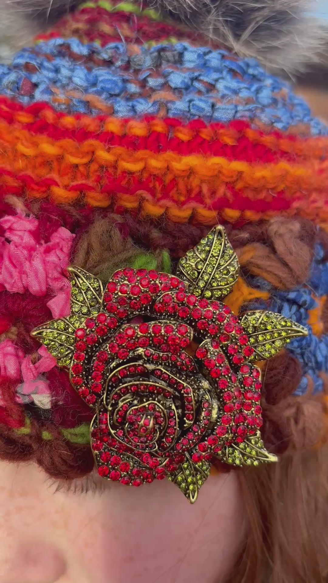 Beautiful snow hat with detachable fox fur Pom Pom and rose brooch! This is Ella James herself wearing this hat and what will soon become your favorite winter hat!